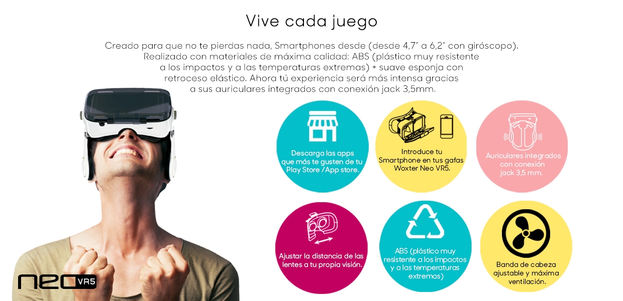 Il Woxter NEO VR5 è un tipo di buste di visione stereoscopiche e funzione uditiva. Sono perfettamente adattati agli smartphone da 4,7 a 6,2 pollici (a seconda della dimensione reale del telefono), e utilizzati con schermi cellulari intelligenti, consentono di godere di giochi panoramici, film 3D, ecc. Completamente regolabile e con cuffie integrate per evitare suoni esterni e rendere questa esperienza unica.