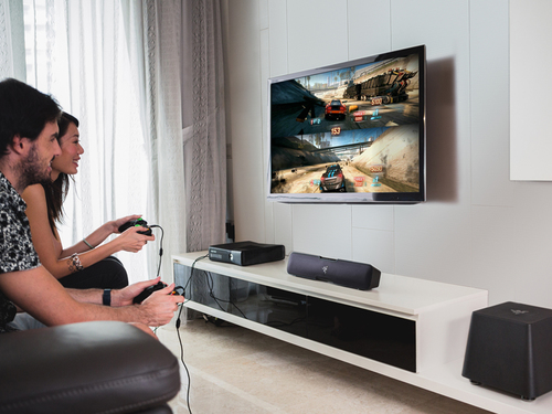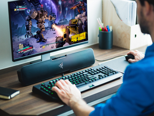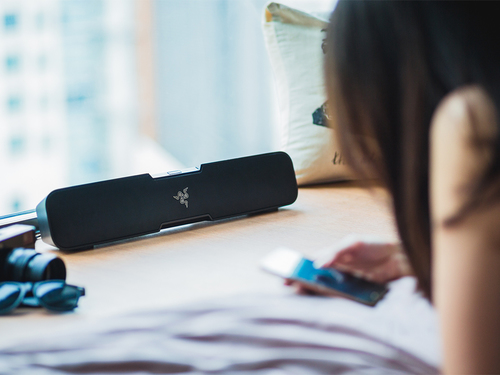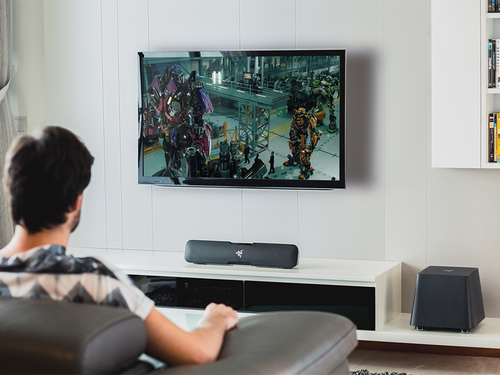 Il canale Razer Leviathan 5.1 La barra sonora di surround è facilmente collegata a qualsiasi monitor desktop o installazione della console di soggiorno. Questa sound bar, con una versatilità per cambiare costantemente la posizione in qualsiasi situazione, include una tecnologia Dolby® completamente innovativa e un subwoofer indipendente con cui è possibile proiettare suoni complessi ricreando le scene epiche di battaglie nel gioco o giocando a "stream" le loro melodie preferite dallo smartphone.